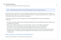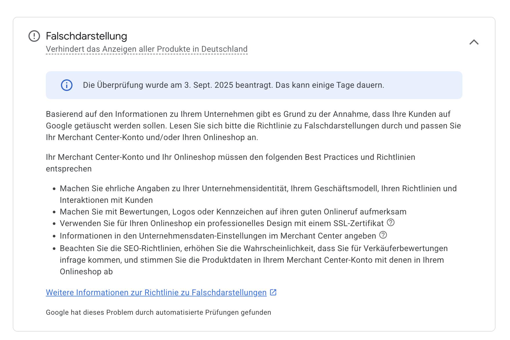 • Kommentare #4 wurde von # Call mit Google Support: Tel: 0800 589 4011 --> Keyword: "Merchant Center" Account ID für den Tel-Support: 806-958-2189 Merchant Center ID: 355781596, Name: Pepeprint Ticket ID: 0-3008000038935 Und hier das Transkript aus dem Call: Die Geschäftsadresse, die Sie im Merchant Center-Konto angegeben haben, sollte mit der auf der Website angegebenen Geschäftsadresse übereinstimmen, was der Fall ist. Als zweites sollte die schriftliche Richtlinie auf der Website vorhanden sein und sie sollte auch mit der schriftlichen Richtlinie übereinstimmen, die Sie im Merchant Center-Konto eingereicht haben, was ebenfalls perfekt übereinstimmt. Und das ist auch ein gutes Signal. zu # Call mit Google Support: Tel: 0800 589 4011 --> Keyword: "Merchant Center" Account ID für den Tel-Support: 806-958-2189 Merchant Center ID: 355781596, Name: Pepeprint Ticket ID: 0-3008000038935 Und hier das Transkript aus dem Call: Die Geschäftsadresse, die Sie im Merchant Center-Konto angegeben haben, sollte mit der auf der Website angegebenen Geschäftsadresse übereinstimmen, was der Fall ist. Als zweites sollte die schriftliche Richtlinie auf der Website vorhanden sein und sie sollte auch mit der schriftlichen Richtlinie übereinstimmen, die Sie im Merchant Center-Konto eingereicht haben, was ebenfalls perfekt übereinstimmt. Und das ist auch ein gutes Signal. Auch Produktbilder und andere Parameter wurden geprüft... Alles fein. Kein Grund für die KI auszuticken. Anscheinend wurde gestern schon ein Einspruch gegen die Sperrung gemeldet. Er beführwortet das und sieht kein Problem dass das wieder entsperrt wird. Zeitraum aber bis zu 7 Tage - ... was aber nicht bedeutet dass es so lange dauern wird. Er will nur in den nächsten 7 Tagen nicht täglich von uns genervt werden :) (Wenn es in 7 tagen noch nicht läuft - meld dich nochmal) geändert